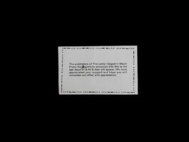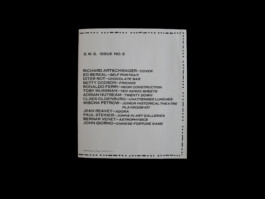 S.M.S. No. 6 includes work by Richard Artschwager (Cover; n.b., coffee stains were part of the piece as conceived by Artschwager), Ed Bereal (Self Portrait), Diter Rot (Chocolate Bar), Betty Dodson (Friends), Ronaldo Ferri (Neon Construction), John Giorno (Chinese Fortune Game), Toby Mussman (Ten Xerox Sheets), Adrian Nutbeam (Twenty Down), Claes Oldenburg (Unattended Lunches), Mischa Petrow (Junior Historical Theater), Jean Reavey (Adora), Paul Steiner (Johns at Art Galleries), and Bernar Venet (Astrophysics). This was the final issue of S.M.S., and includes a note from the publisher announcing its completion.