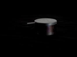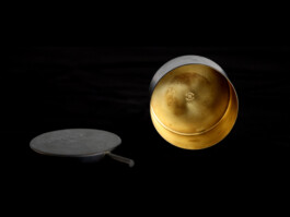 Cylindrical vanity box in patinated brass. Mirror inside lid. Produced by the Werkstätte Carl Auböck. Auböck and Lee West logo impressed into base.